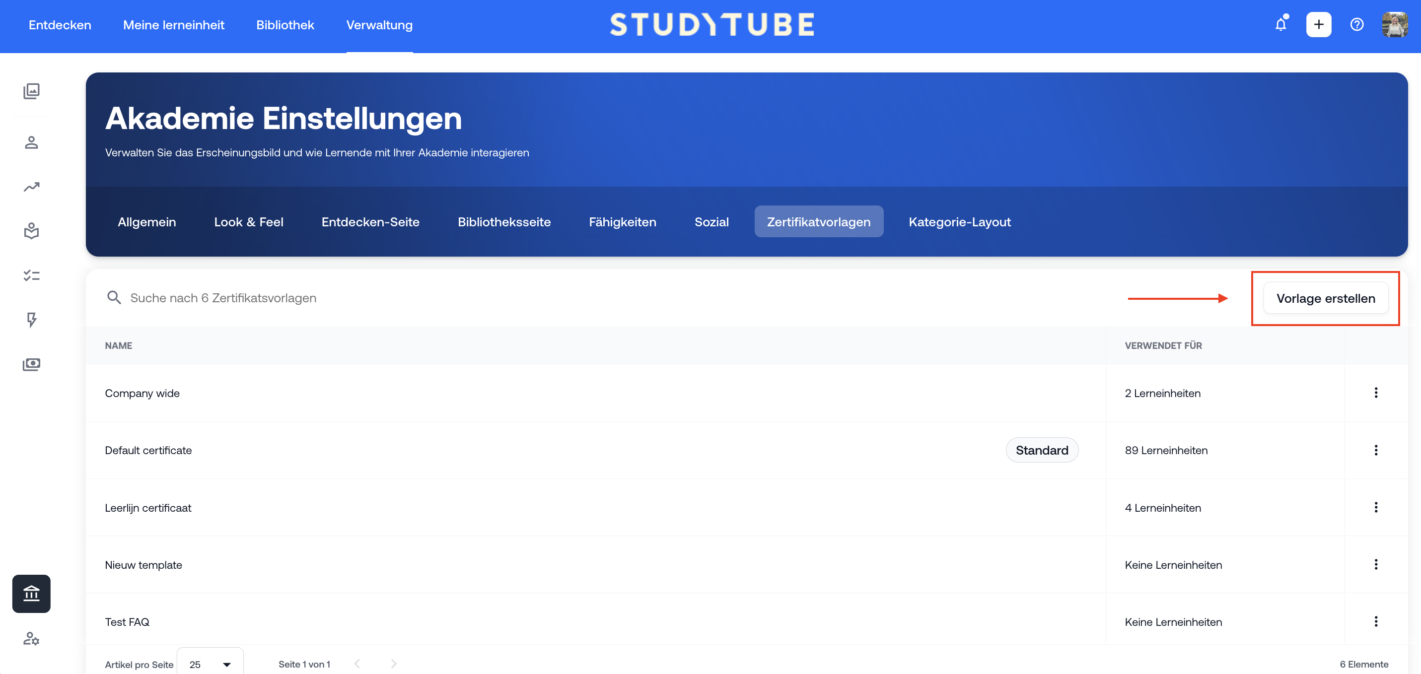 Verwalten > Academy-Einstellungen > Zertifikatvorlagen > Vorlage erstellen