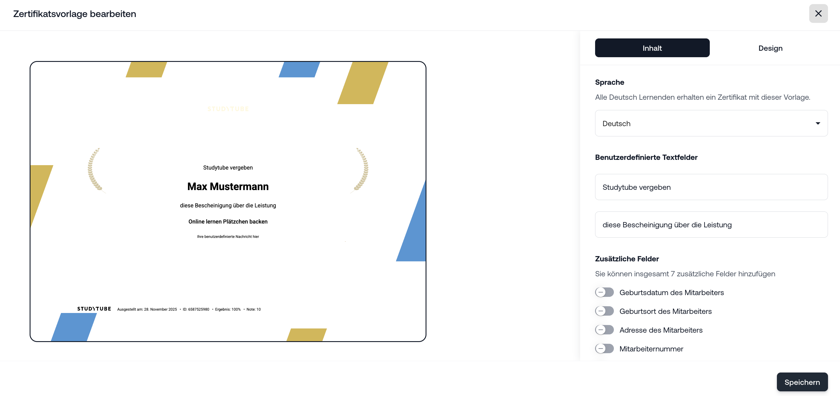 Stellen Sie sicher, dass das Zertifikat optisch zu Ihrer Organisation oder Academy passt. Sie können u. a. folgende Elemente anpassen: