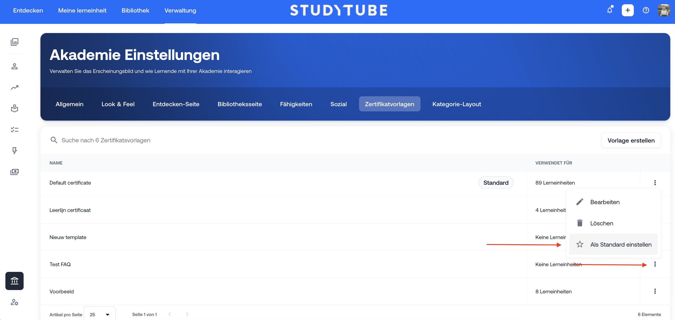Gehen Sie zu Verwalten > Academy-Einstellungen > Zertifikatvorlagen, klicken Sie auf die drei Punkte neben der gewünschten Vorlage und wählen Sie „Als Standard festlegen“.