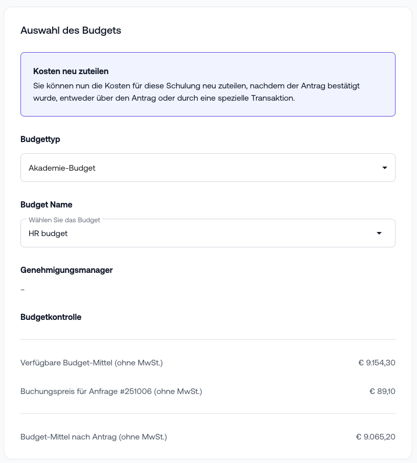 Die Teamleitung wählt das passende Budget aus (sofern entsprechende Rechte vorhanden sind) oder prüft, ob das persönliche Budget des*der Mitarbeitenden genutzt werden kann.