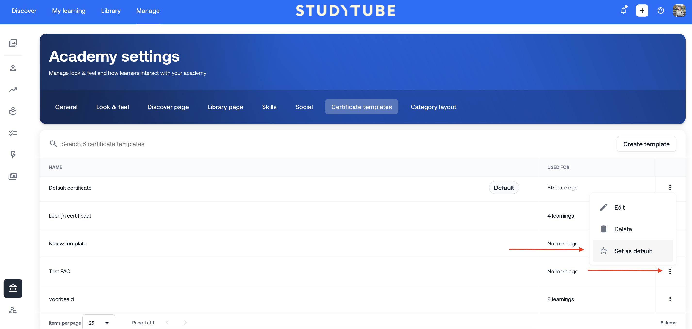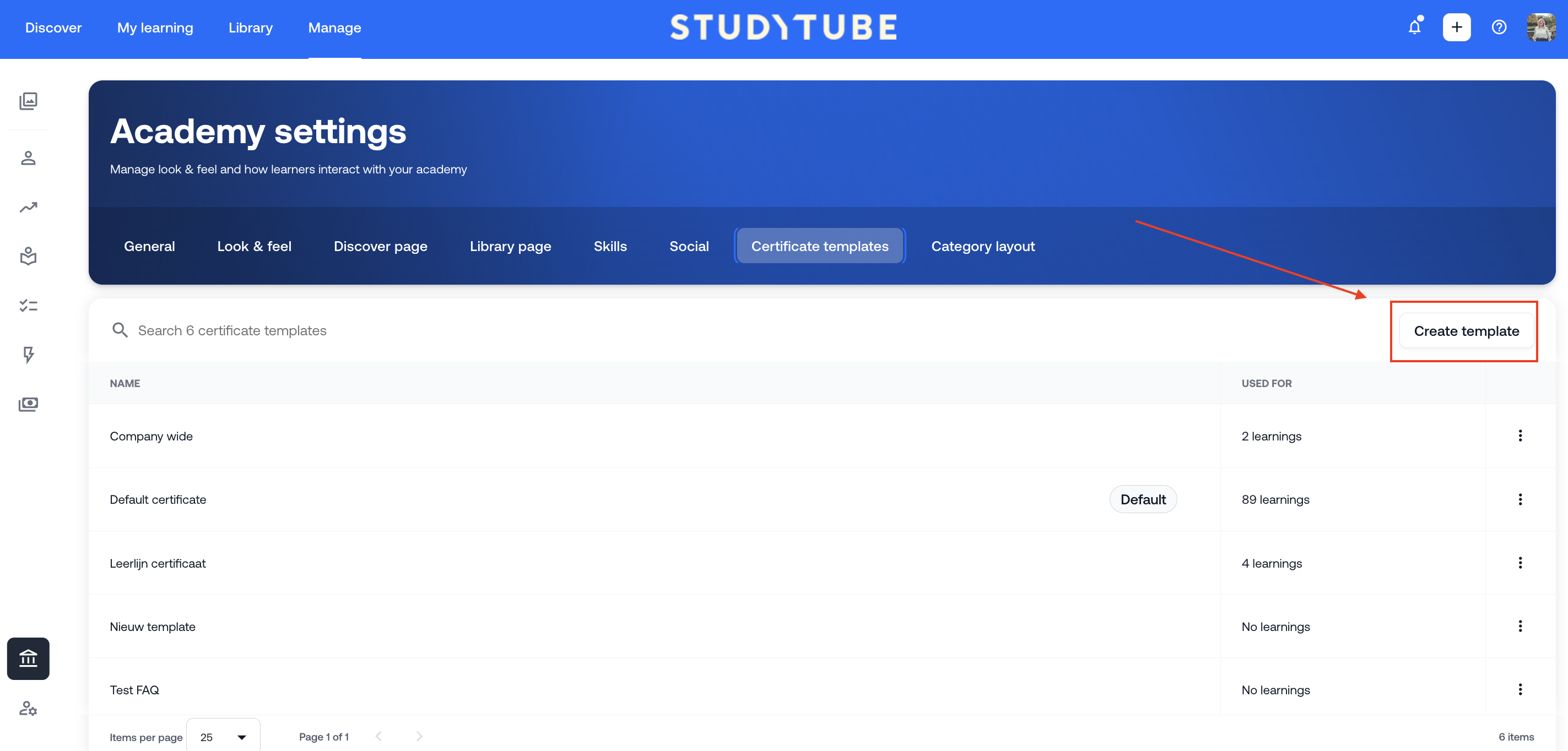 Manage > Academy settings > Certificate templates > Create template