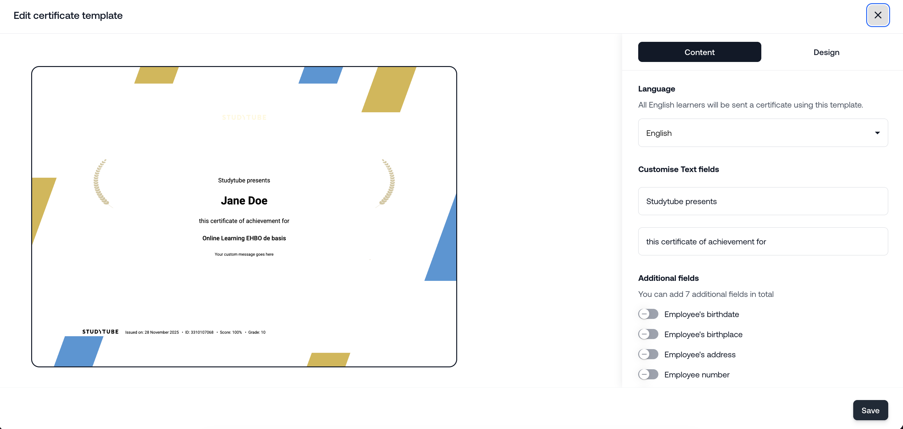 Make sure the certificate visually matches your organization or academy. You can customize the following: