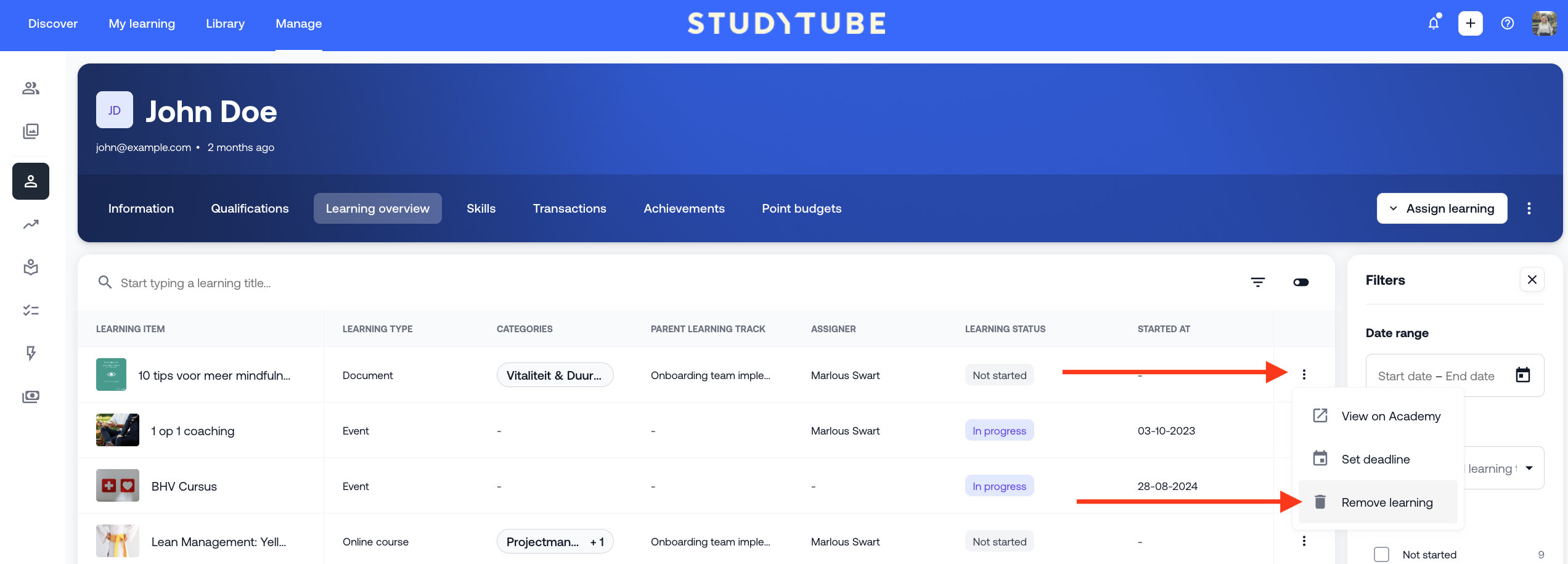 Note: When you remove a learning Track, the individual learnings within that Learning Track (such as online trainings or articles) are not automatically removed from the learning overview. If you also want to remove those, you’ll need to do so manually. Additionally, a learning that is part of a learning track cannot be removed from the learning overview before the learning track has been removed from the overview.