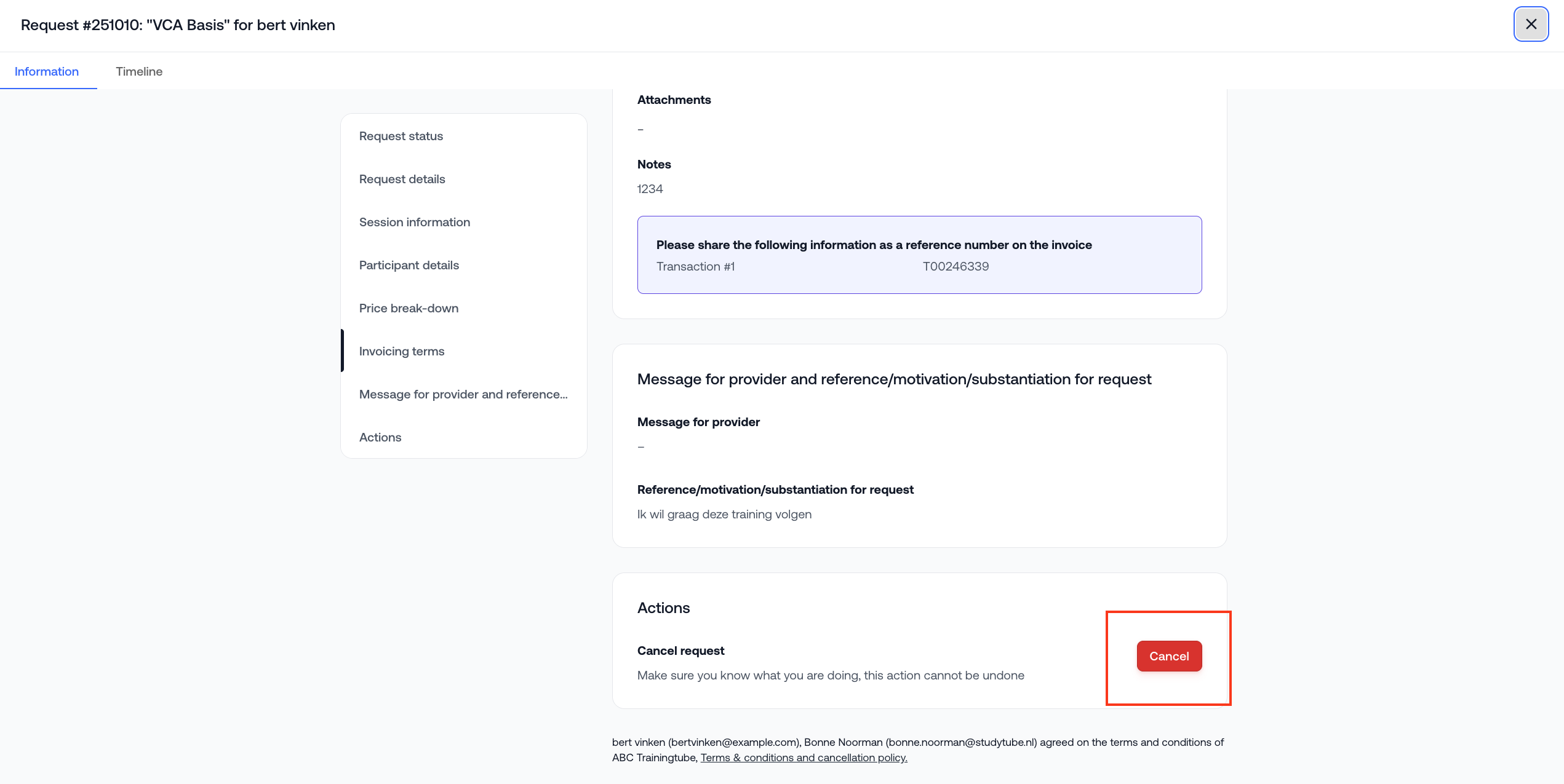 Note: Cancelling a request via the LMS may result in cancellation fees charged by the provider. Be sure to check this before proceeding with the cancellation.