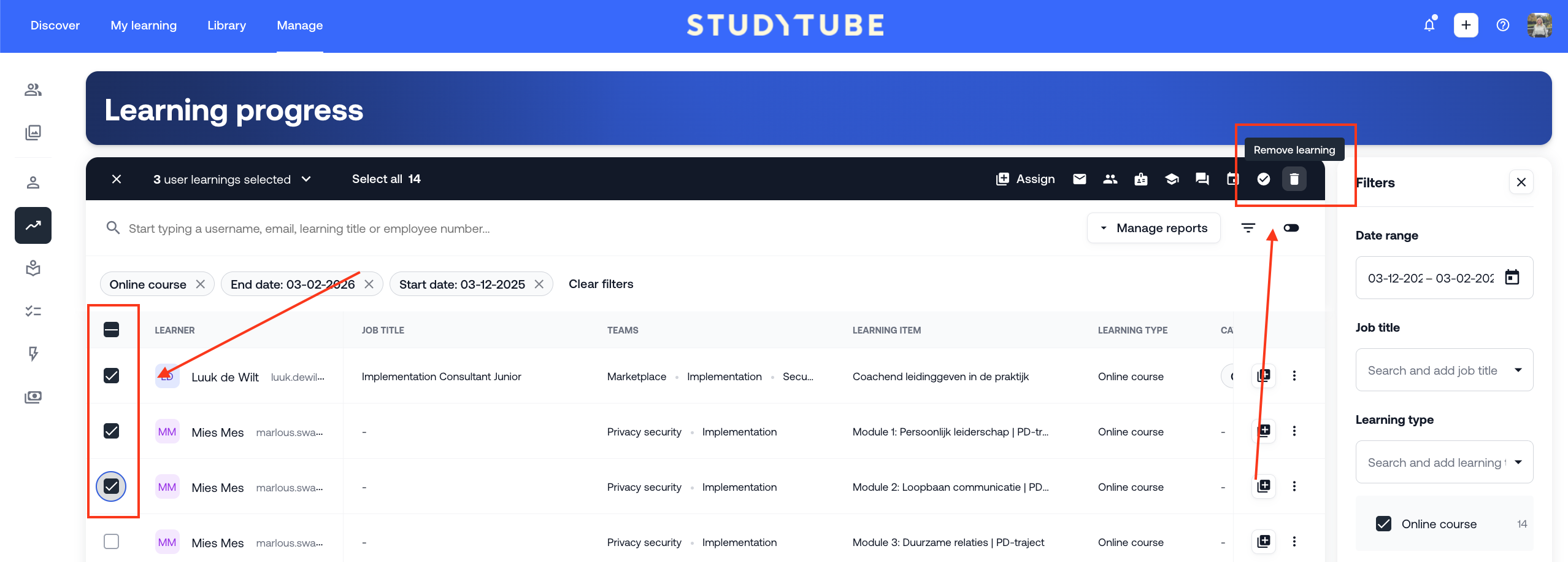 Or do you want to remove learnings across multiple employees at once? This is possible via the ‘Learning Progress’ report.