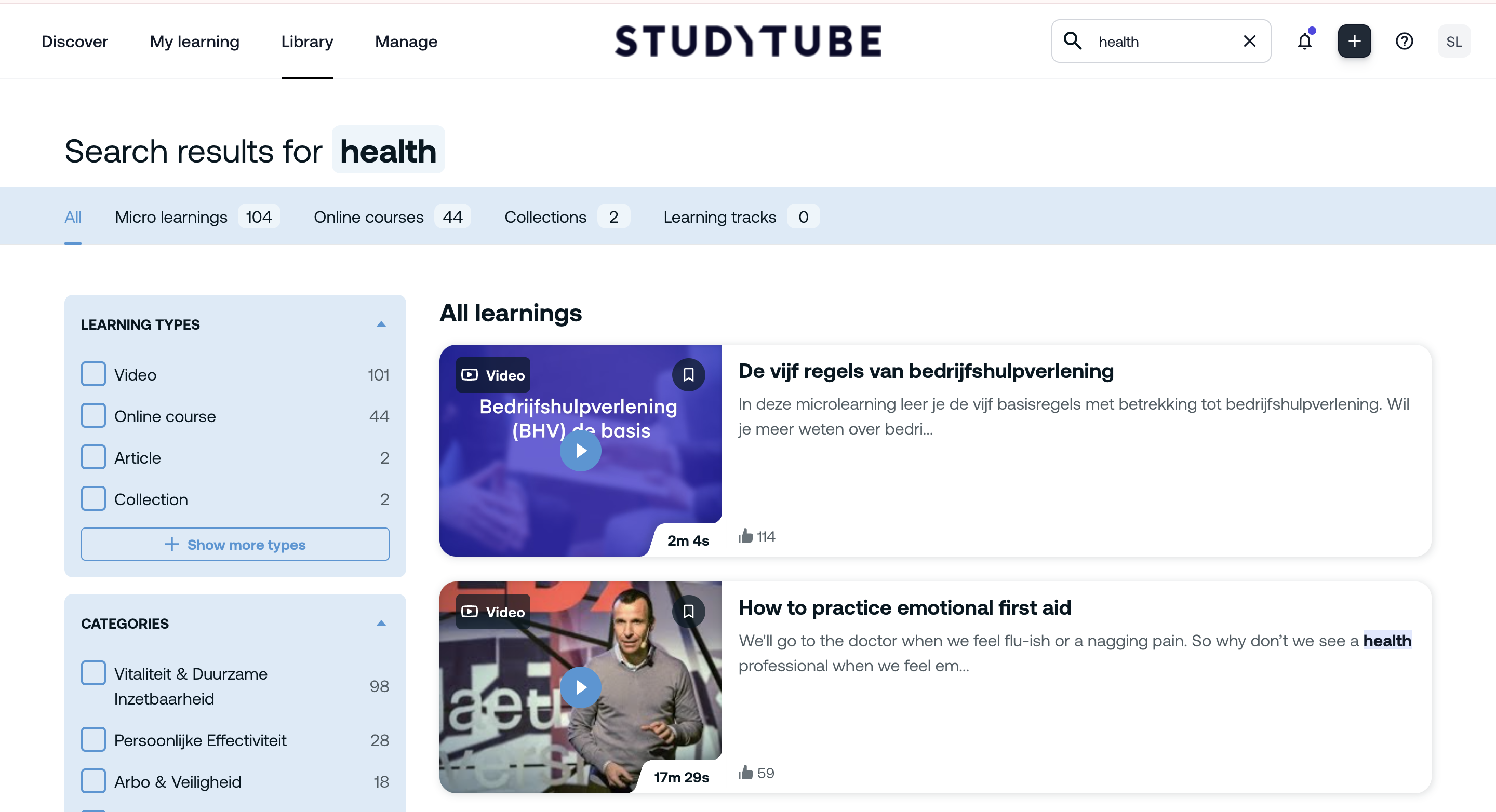 The term health does not appear anywhere in the title or description. However, if you type ‘health’ in the search bar, the training will still be displayed.