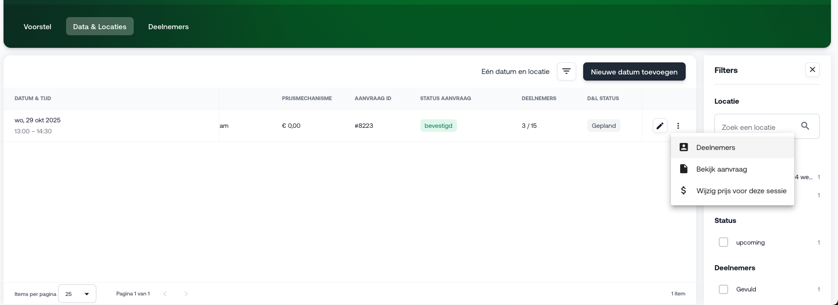Je kunt de deelnemers per sessie inzien, wanneer je in de in-company training naar ‘Data & Locaties’ gaat. Klik bij een sessie aan het eind van regel op de 3 puntjes en klik op deelnemers.