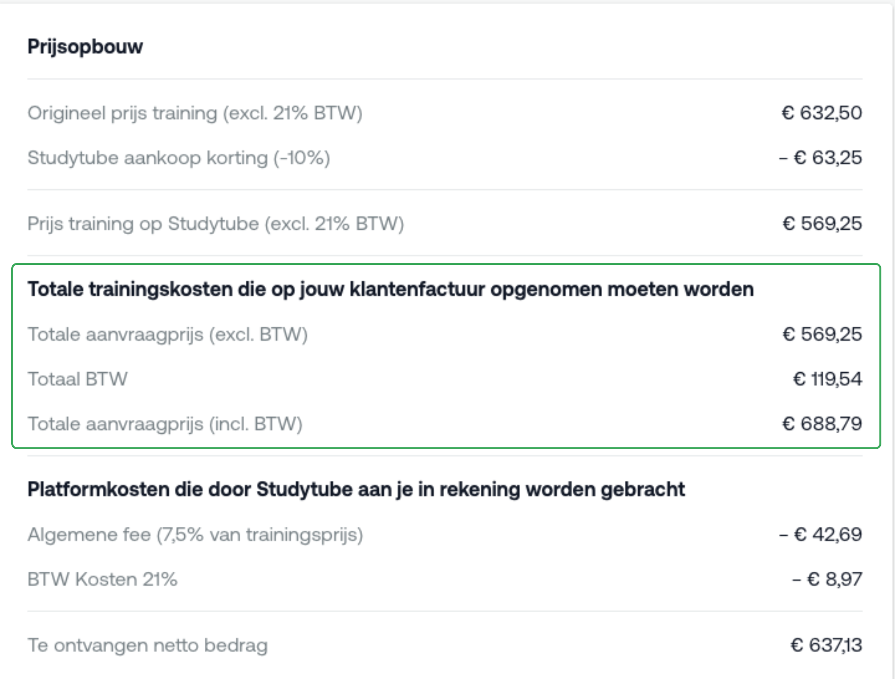 Als je een factuur opstelt voor een facturatieservice klant dan moet de fee er niet afgehaald worden. Je dient enkel de trainingsprijs te factureren die staat bij 'aanvraag prijs'. De factuur is namelijk van de opleider aan de klant gericht.