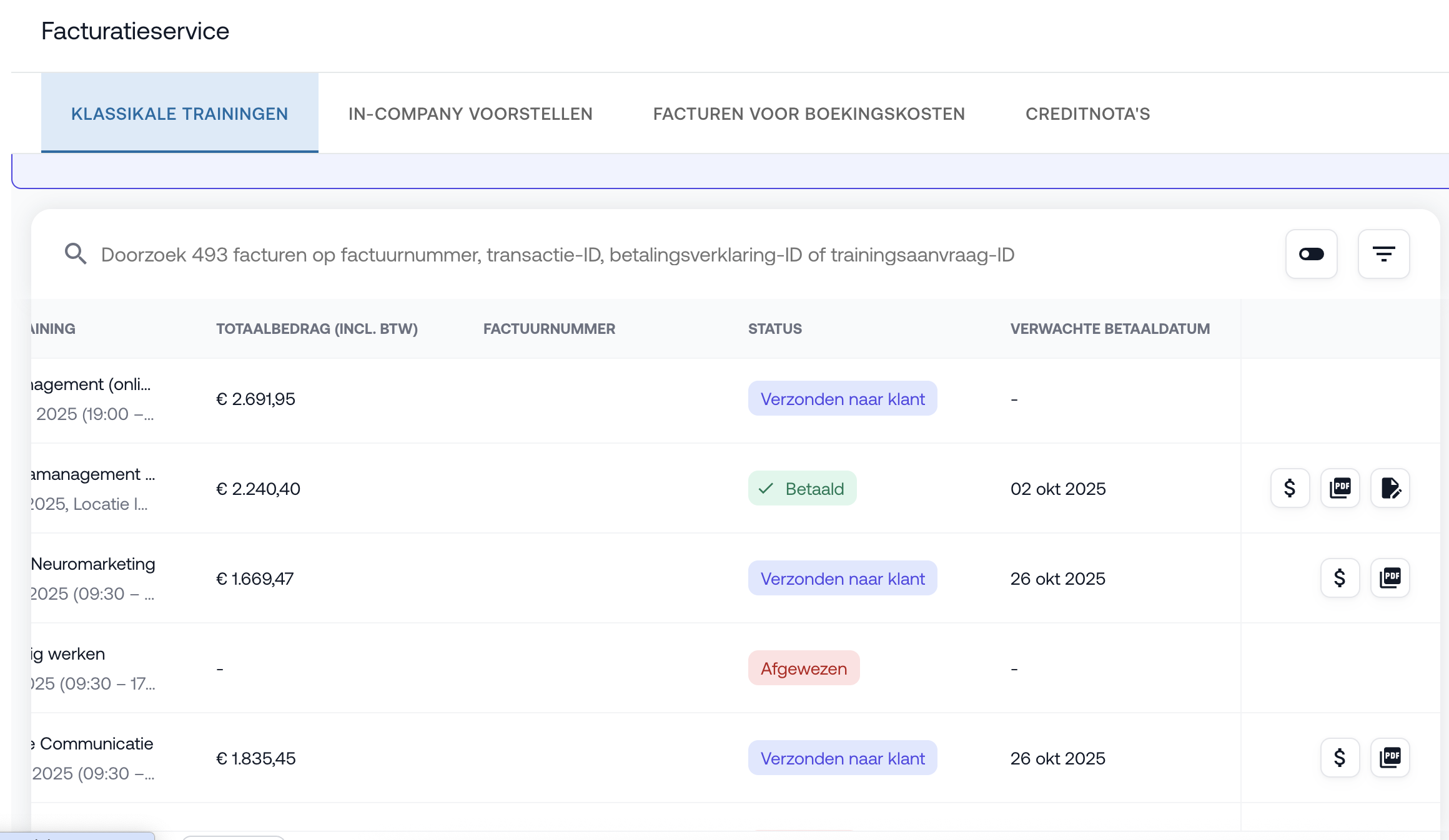 - Ga in het menu naar Facturatieservice en kies vervolgens voor Klassikale trainingen of In-company voorstellen, afhankelijk van welke training je wilt crediteren.