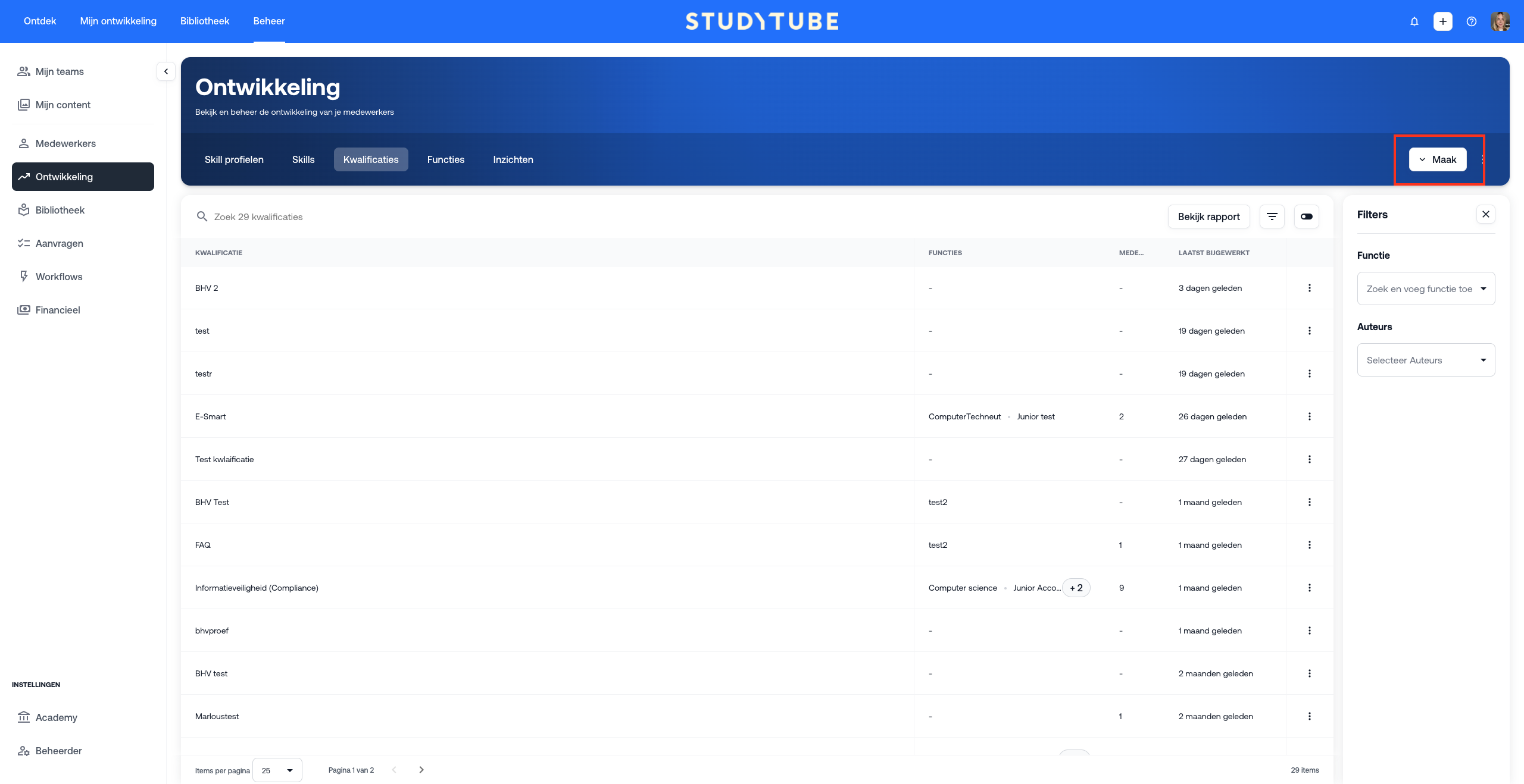 Met de kwalificatiemodule van Studytube kun je eenvoudig verplichte opleidingen instellen, beheren en monitoren. In het LMS-beheerscherm heb je toegang tot het onderdeel Kwalificatie Management, waar je kwalificaties kunt aanmaken en beheren.