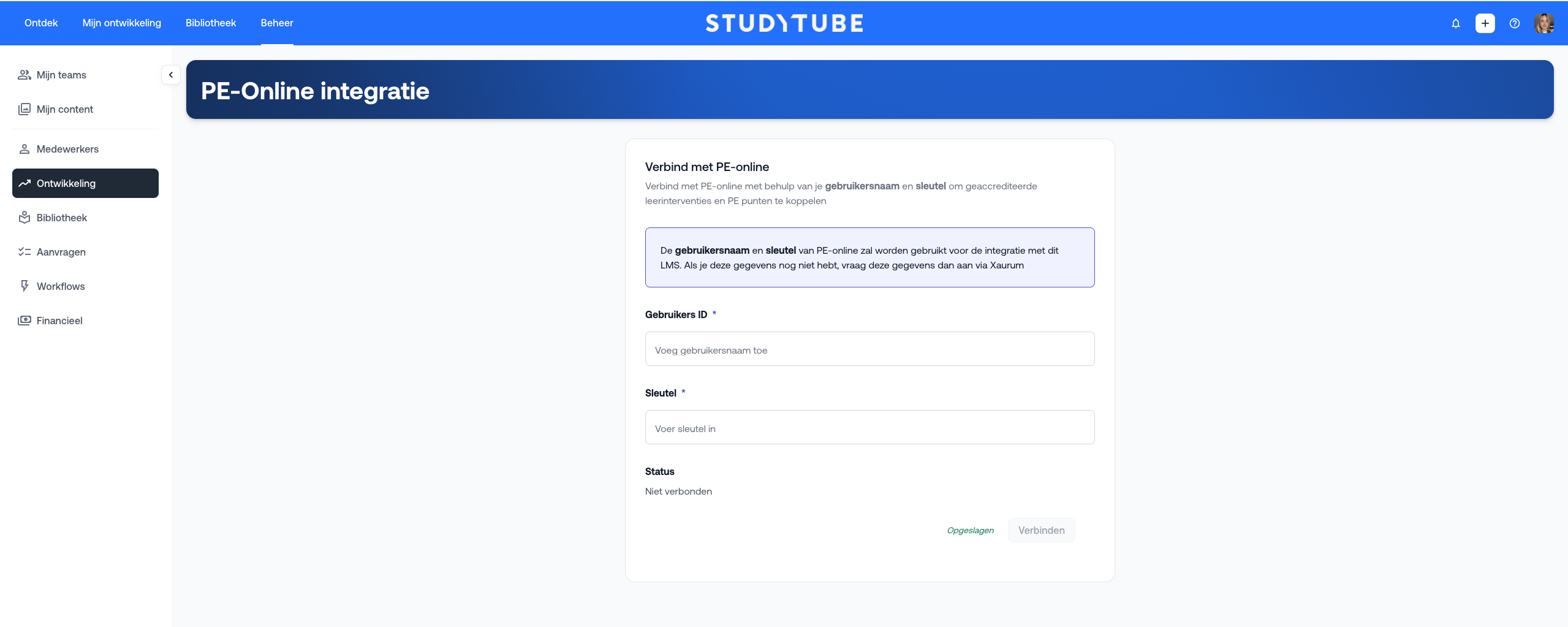 Als je een contract hebt met Xaurum (het bedrijf achter PE-online), ontvang je een User ID (gebruikersnaam) en een User Key (wachtwoord). Met deze gegevens kun je de koppeling met Studytube tot stand brengen.