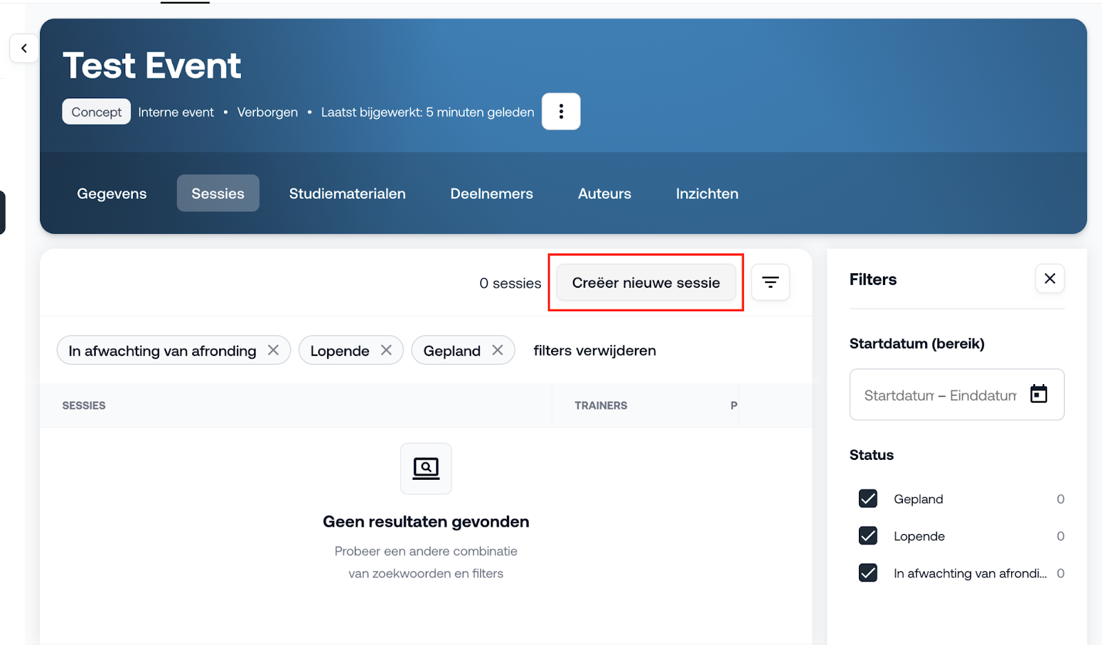 Na het aanmaken verschijnt de sessie in het overzicht onder het tabblad ‘Sessies’ binnen het event. Heb je hulp nodig bij het toevoegen van sessies? Neem gerust contact op met onze supportafdeling.