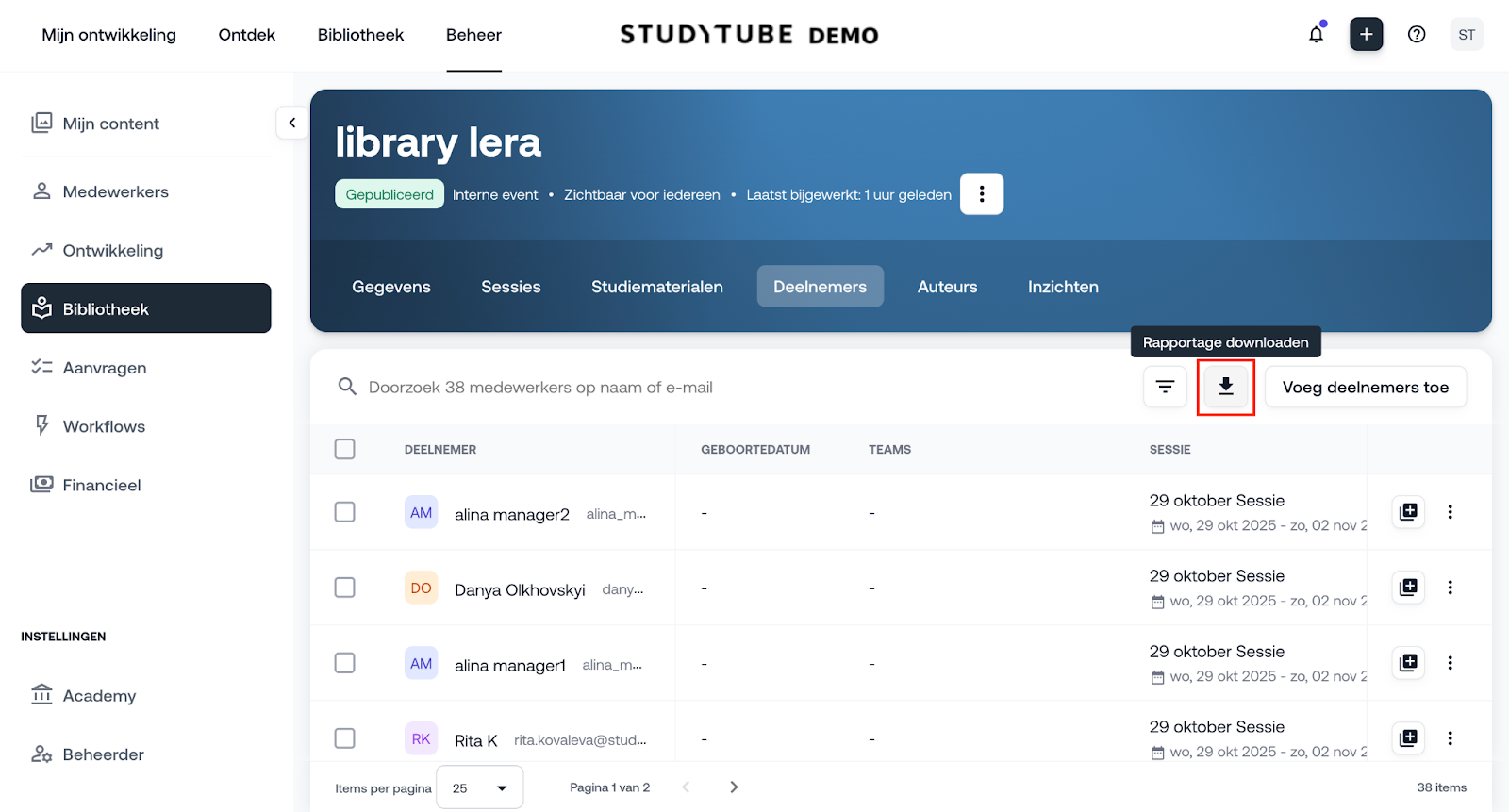Zie je de downloadknop niet? Dan heb je waarschijnlijk niet de juiste rechten om deelnemersdata van interne events te exporteren. Neem in dat geval contact op met een beheerder van je academy en vraag of zij je deze rechten kunnen toekennen.