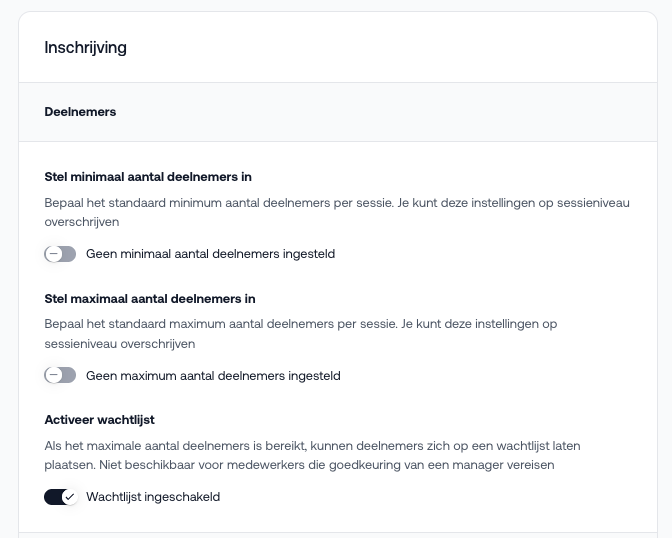 Bepaal het maximum aantal deelnemers per sessie. Zodra dit aantal is bereikt, wordt verdere registratie geblokkeerd.Activeer wachtlijst