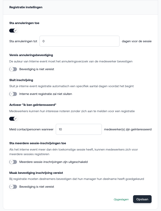 Geef medewerkers de mogelijkheid om hun inschrijving zelf te annuleren. Je kunt hierbij instellen tot hoeveel dagen vóór de sessie dat nog mag.Vereis annuleringsbevestiging