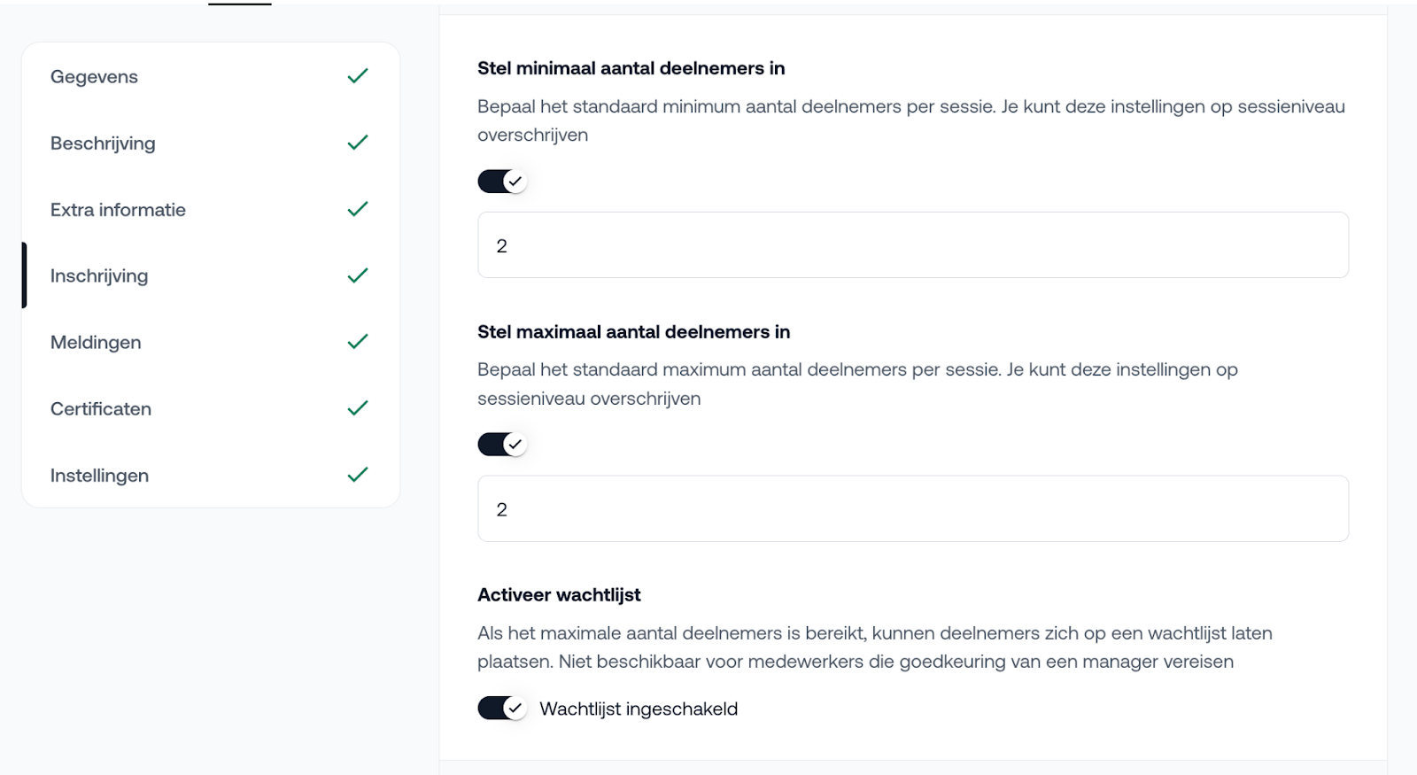 Zet deze aan om de wachtlijst te activeren zodra het maximum aantal deelnemers is bereikt.