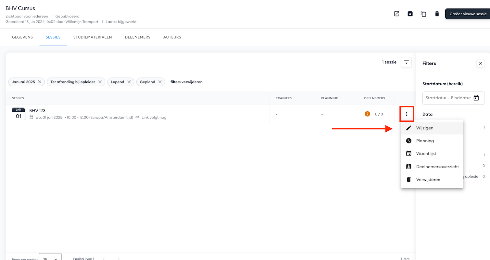 Zolang een sessie nog niet heeft plaatsgevonden, kun je de datum, tijd en locatie aanpassen. Dit kan handig zijn als je bijvoorbeeld een wijziging in de planning hebt of een andere ruimte moet reserveren.