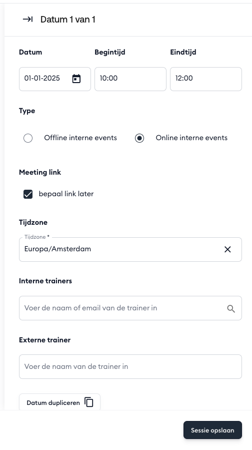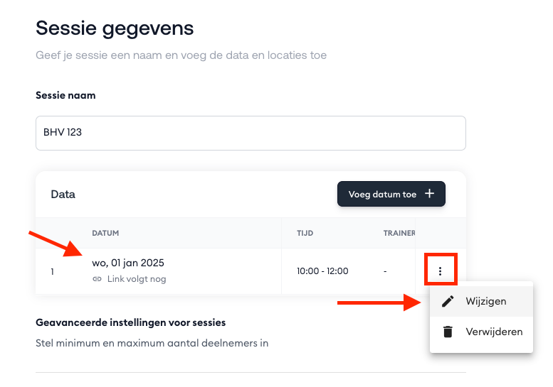 ? Let op: Als een sessie meerdere data bevat, kun je geen enkele datum meer aanpassen zodra de eerste datum is gestart. Houd hier dus rekening mee bij het aanmaken van sessies.