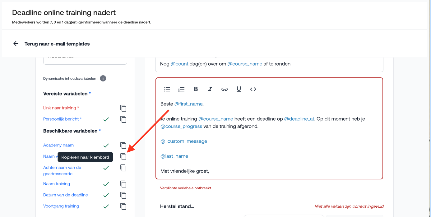 Let op! Bij het overnemen van variabelen is het belangrijk dat je deze kopieert naar het klembord en deze hierna plakt in het template, deze zal dan in het blauw verschijnen. Als de variabel niet in het blauw staat, zal deze niet ingevuld worden als variabel in de mail.