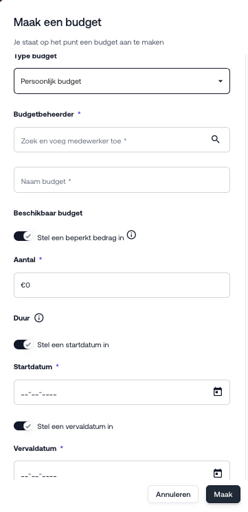 Startdatum – Vanaf wanneer het budget geldig is (niet verplicht)