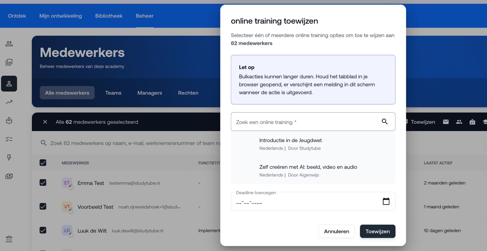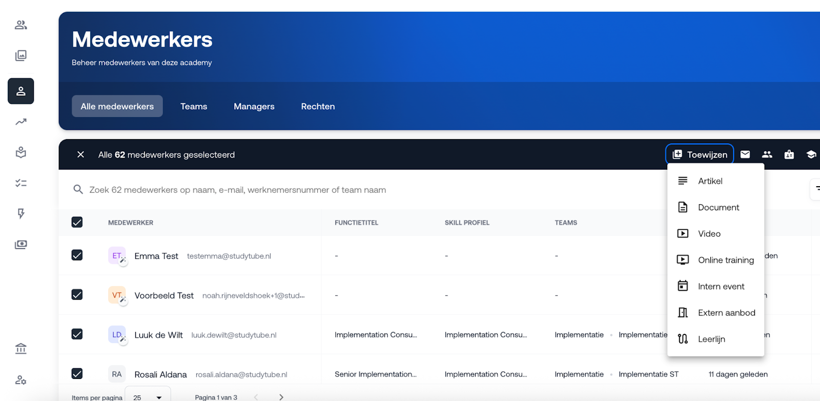 In dit artikel lees je hoe je eenvoudig meerdere acties tegelijk uitvoert voor een (grote) groep medewerkers via de pagina 'Alle medewerkers' in het LMS.