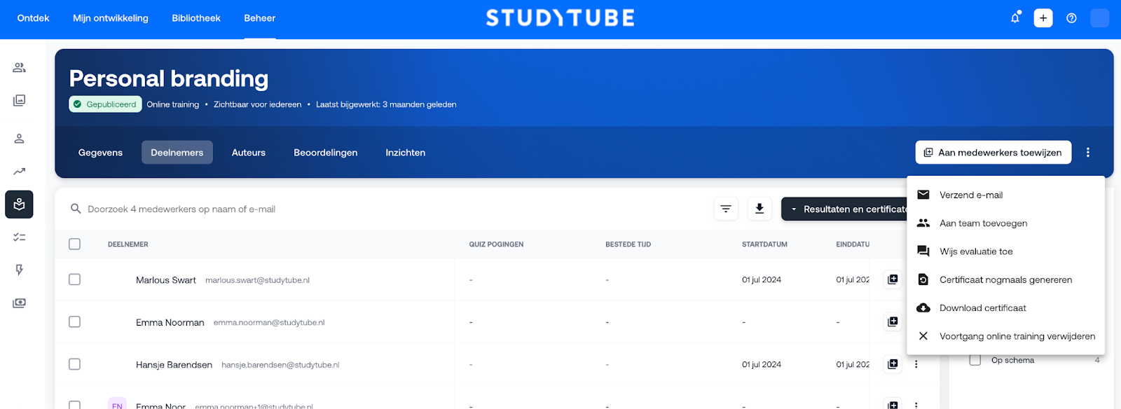 Voor online trainingen is er een tabblad Deelnemers beschikbaar. Hier zie je welke medewerkers de training volgen of hebben afgerond, inclusief hun leerstatus. Zo hoef je geen apart rapport te draaien — alle belangrijke informatie is direct per training inzichtelijk.