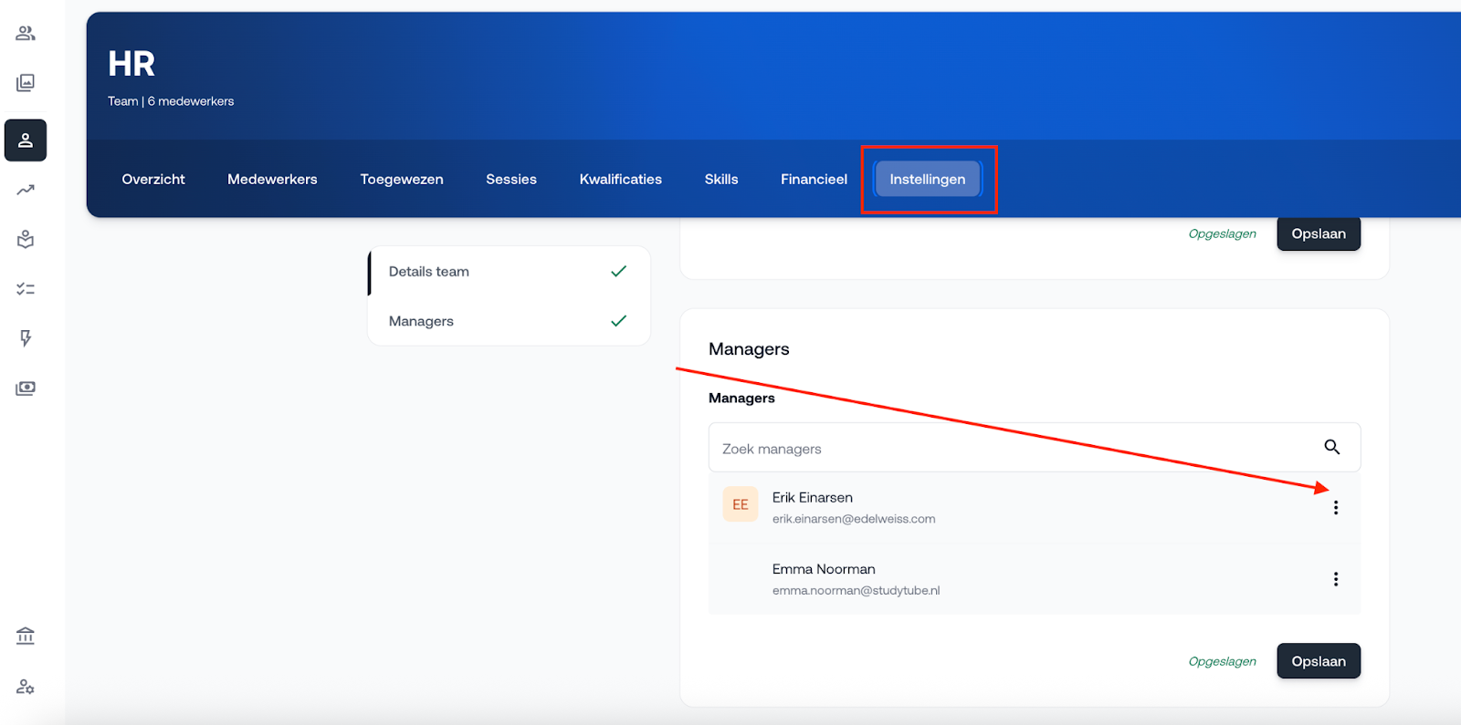 Scroll naar beneden tot je de Teammanagers van dat team ziet.