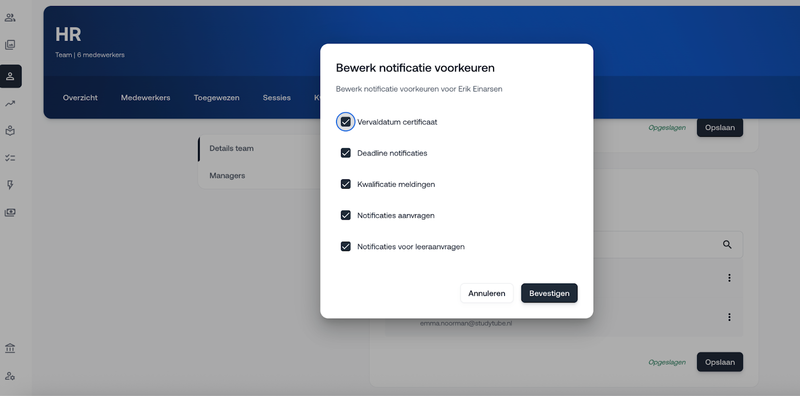 Als LMS-beheerder kun je bepalen of Teammanagers meldingen ontvangen over hun teamleden. Je kunt dit op twee manieren instellen: