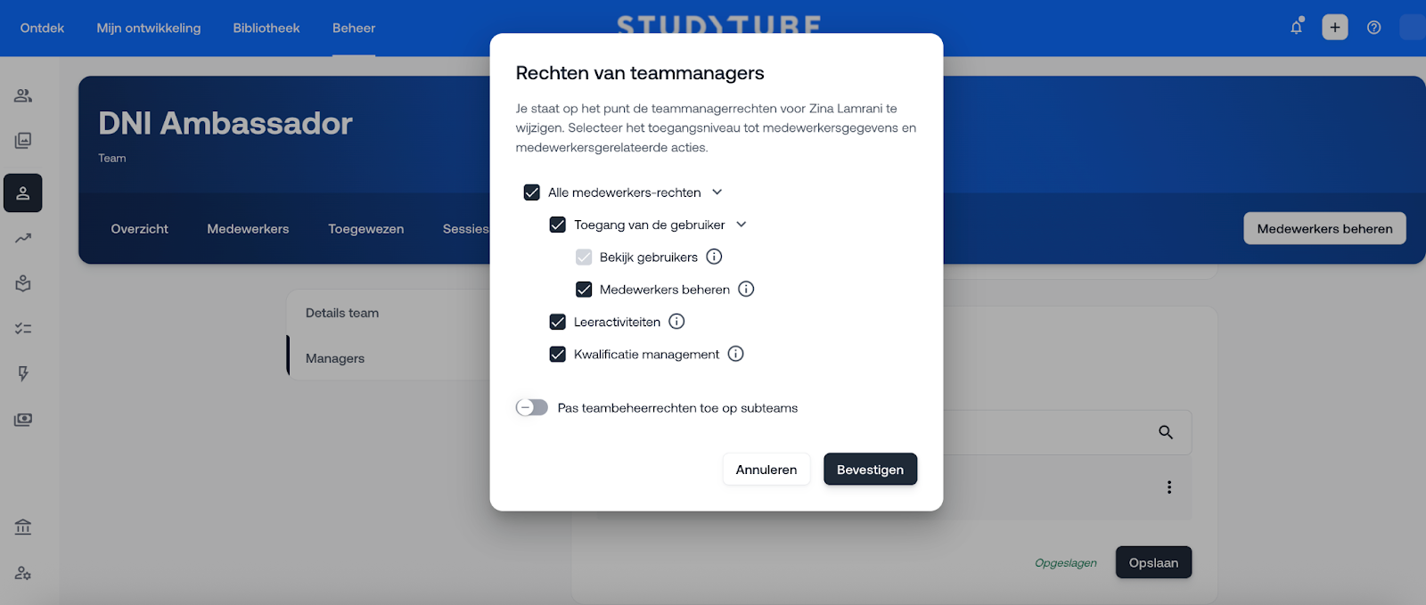 Als LMS-beheerder kun je bepalen welke gegevens en acties teammanagers mogen inzien of uitvoeren binnen hun team(s). Je hebt hierbij volledige controle per team en per manager.