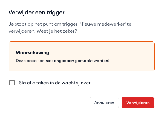 Bij het verwijderen van een trigger verschijnt een pop-up met de vraag of je de taken in de wachtrij wilt overslaan. Dit is vooral van belang als de trigger acties bevat met een ingestelde vertraging.