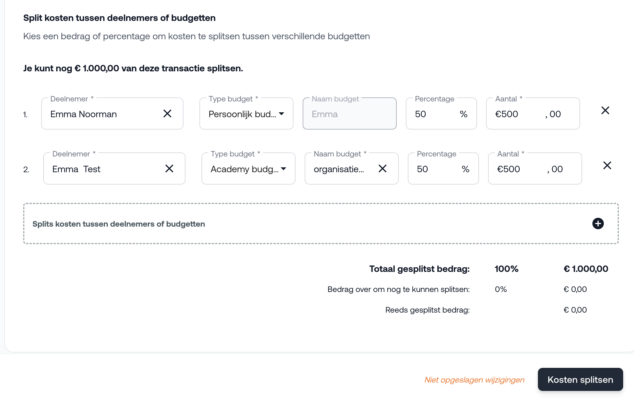 Nadat de aanvraag is goedgekeurd door de accorderingsmanager, kun je direct de kosten splitsen.