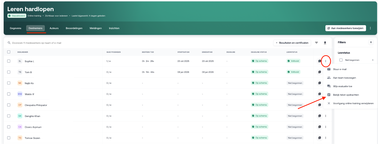 Bij online trainingen kun je ingezonden tekstopdrachten en video-opdrachten van deelnemers terugvinden. Volg hiervoor deze stappen: