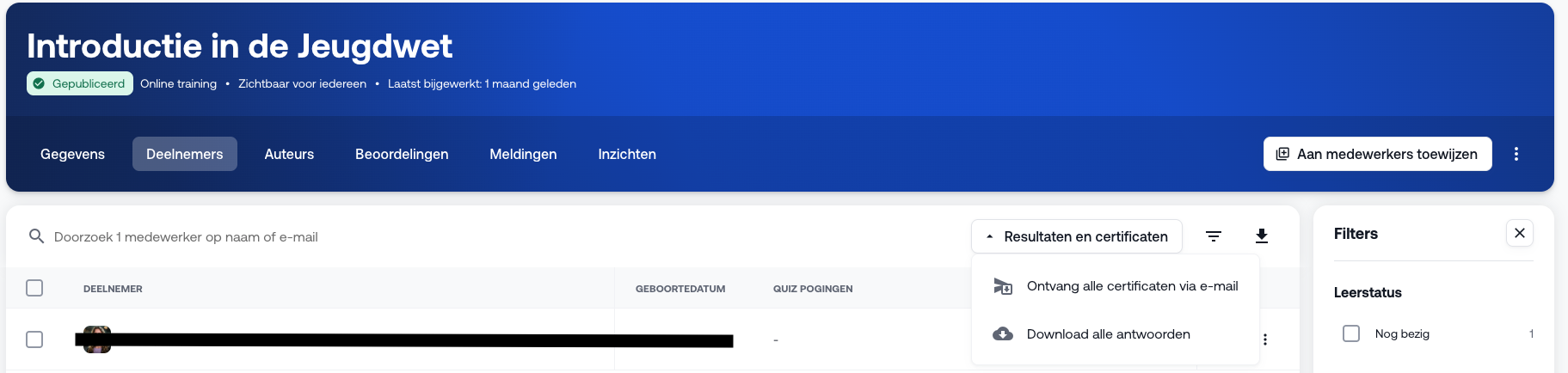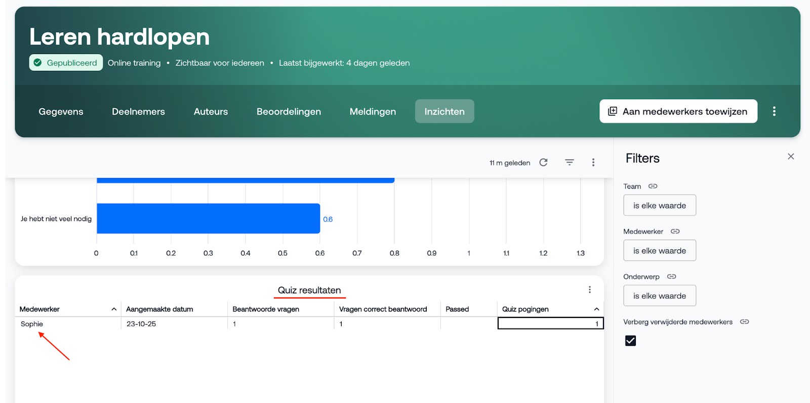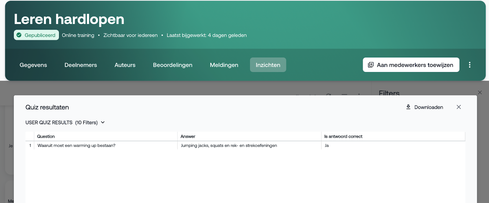 Heb je een quiz toegevoegd aan de online training? Dan bekijk je de resultaten als volgt:
