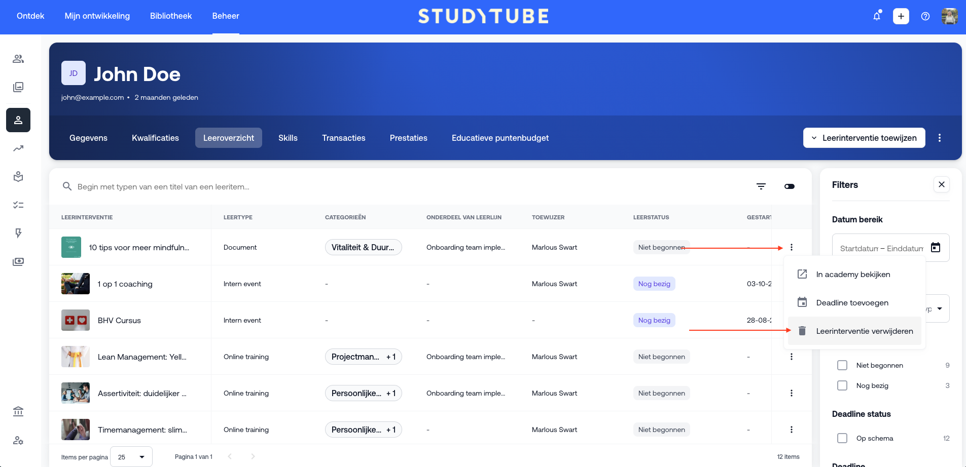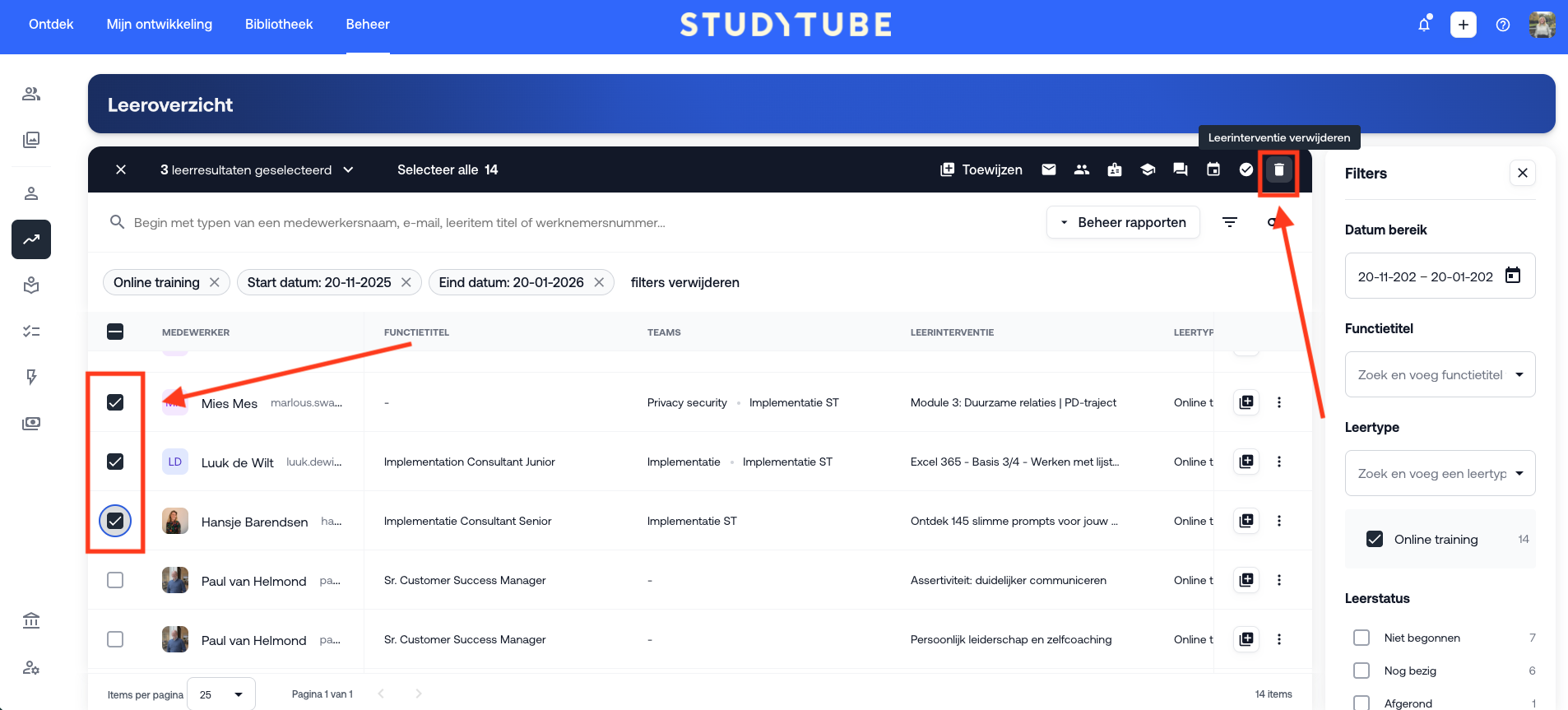 Of wil je leerinterventies in één keer verwijderen bij meerdere medewerkers? Dat kan via de rapportage ‘Leeroverzicht’.