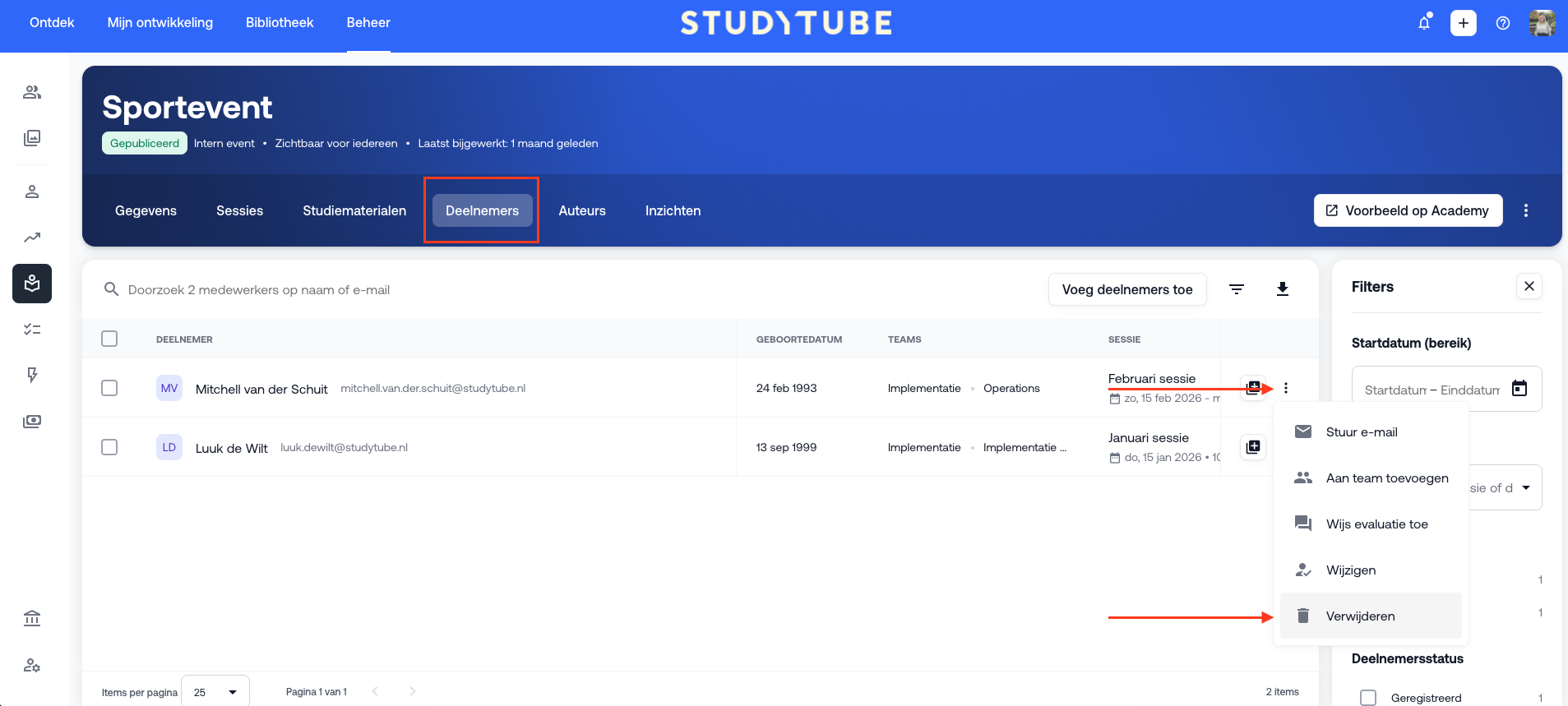 Interne events en in-company trainingen kun je niet rechtstreeks verwijderen via het leeroverzicht.