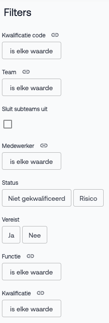 Met deze filters kun je de rapportage specifieker maken en bijvoorbeeld alleen de kwalificatiestatus van een bepaald team, functie of medewerker bekijken.