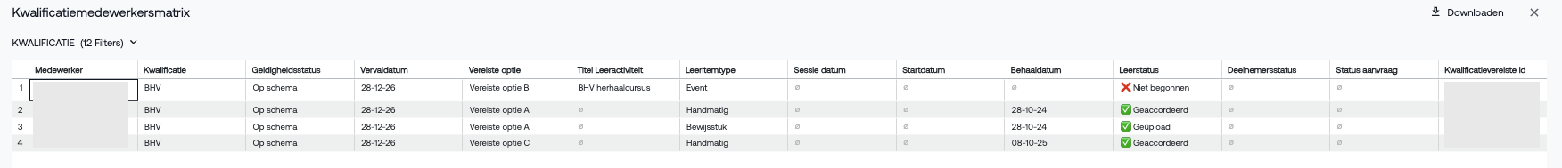 Op deze manier krijg je snel en duidelijk inzicht in de voortgang, herhaling en geldigheid van een kwalificatie per medewerker.
