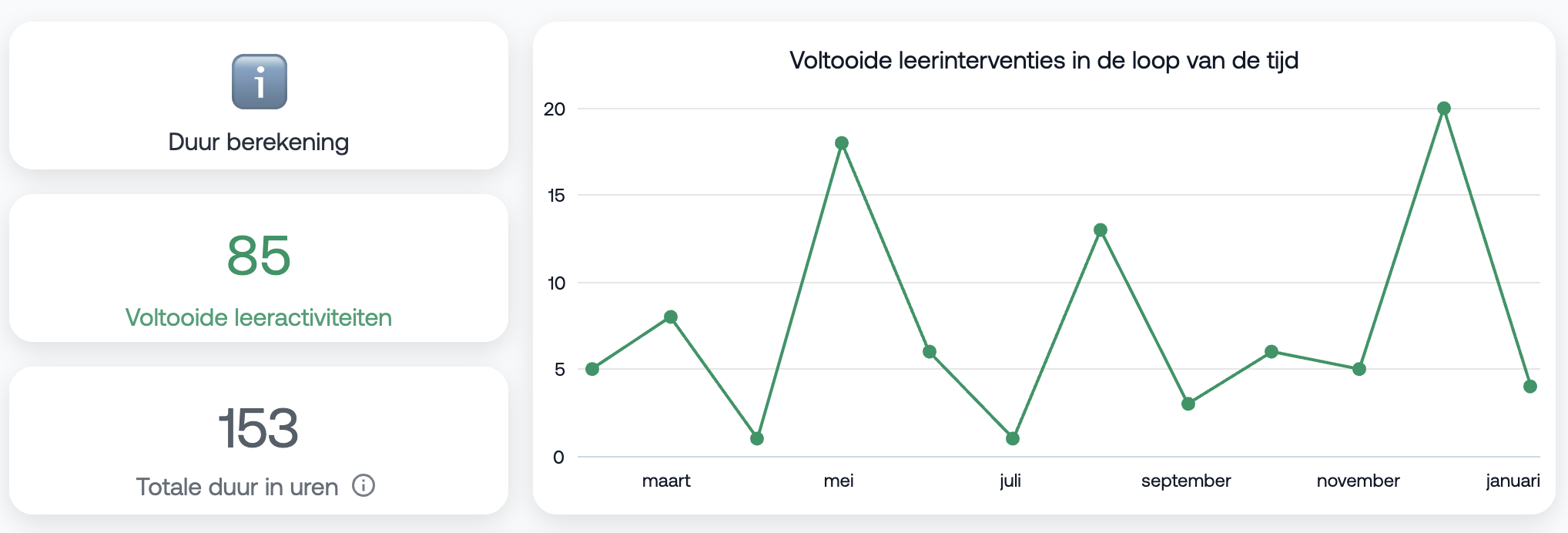 In dit overzicht zie je het aantal afgeronde leerinterventies per maand. Hiermee krijg je inzicht in leerpatronen en zie je of er periodes zijn waarin er meer of juist minder geleerd wordt.