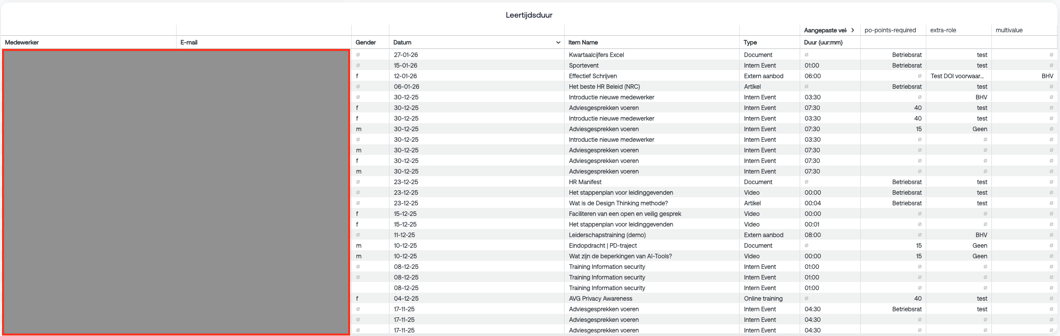 In dit overzicht zie je per medewerker welke trainingen zijn afgerond. Daarnaast vind je hier de volgende gegevens: