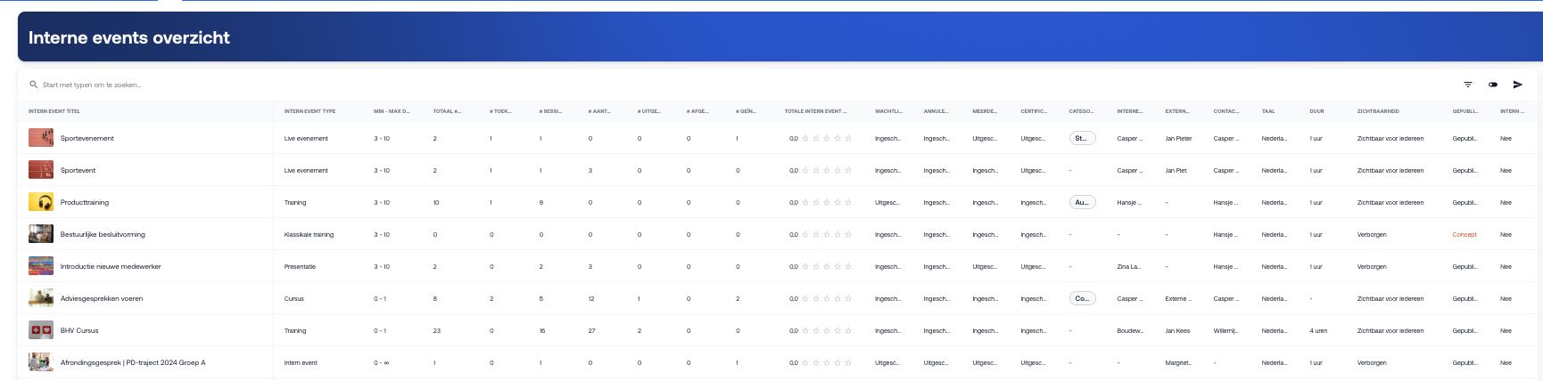 De interne events overzicht rapportage geeft een volledig overzicht van alle interne events binnen de academy. Per event zie je onder andere de volgende informatie: