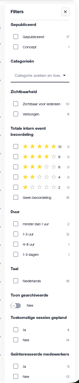 Deze rapportage helpt je om snel inzicht te krijgen in het aanbod en de prestaties van interne events.