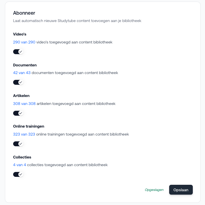 Onder het tabblad ‘Abonneer’ kun je instellen dat nieuwe content van Studytube automatisch wordt toegevoegd aan je bibliotheek. Hierbij geef je ook aan met welke zichtbaarheidsinstellingen dit moet gebeuren (bijv. direct zichtbaar of onzichtbaar voor medewerkers).