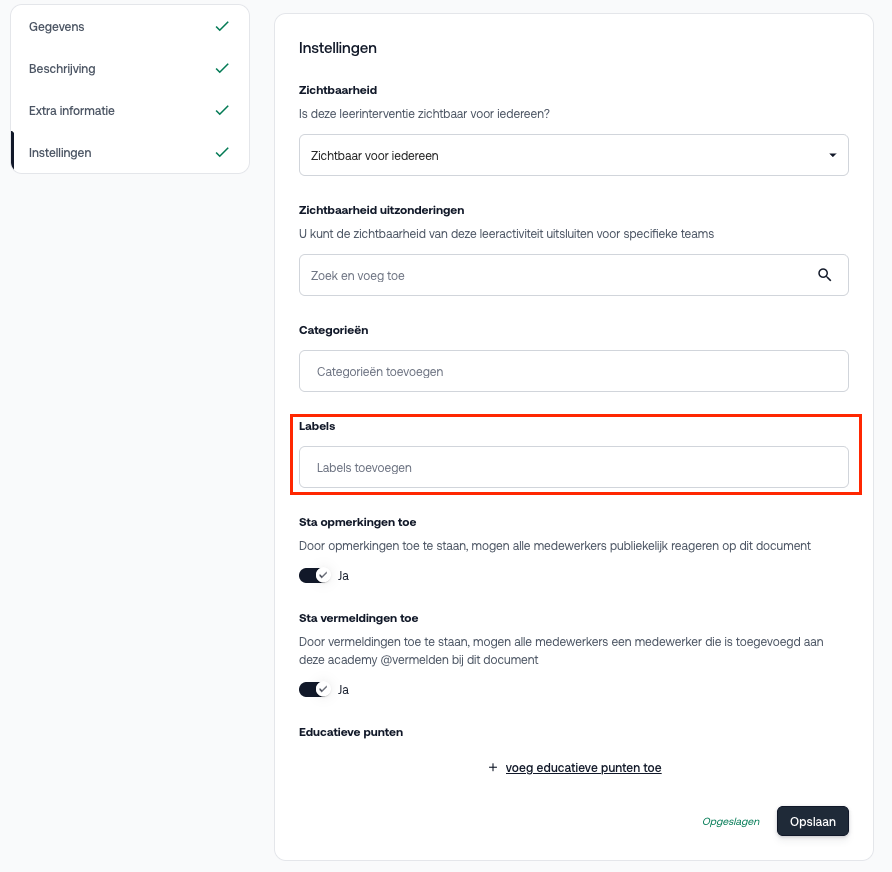 Met labels breid je de zoekmogelijkheden binnen het LMS uit. Ze zorgen ervoor dat leerinterventies beter vindbaar zijn, ook wanneer het zoekwoord niet letterlijk in de titel of beschrijving voorkomt.