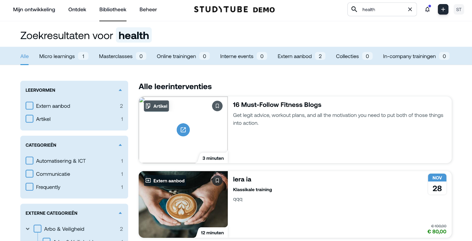 Stel: je voegt het label health toe aan het artikel 16 Must-Follow Fitness Blogs. Deze term komt nergens in de titel of beschrijving voor, maar als je nu in de zoekbalk ‘health’ intypt, wordt de training tóch weergegeven.